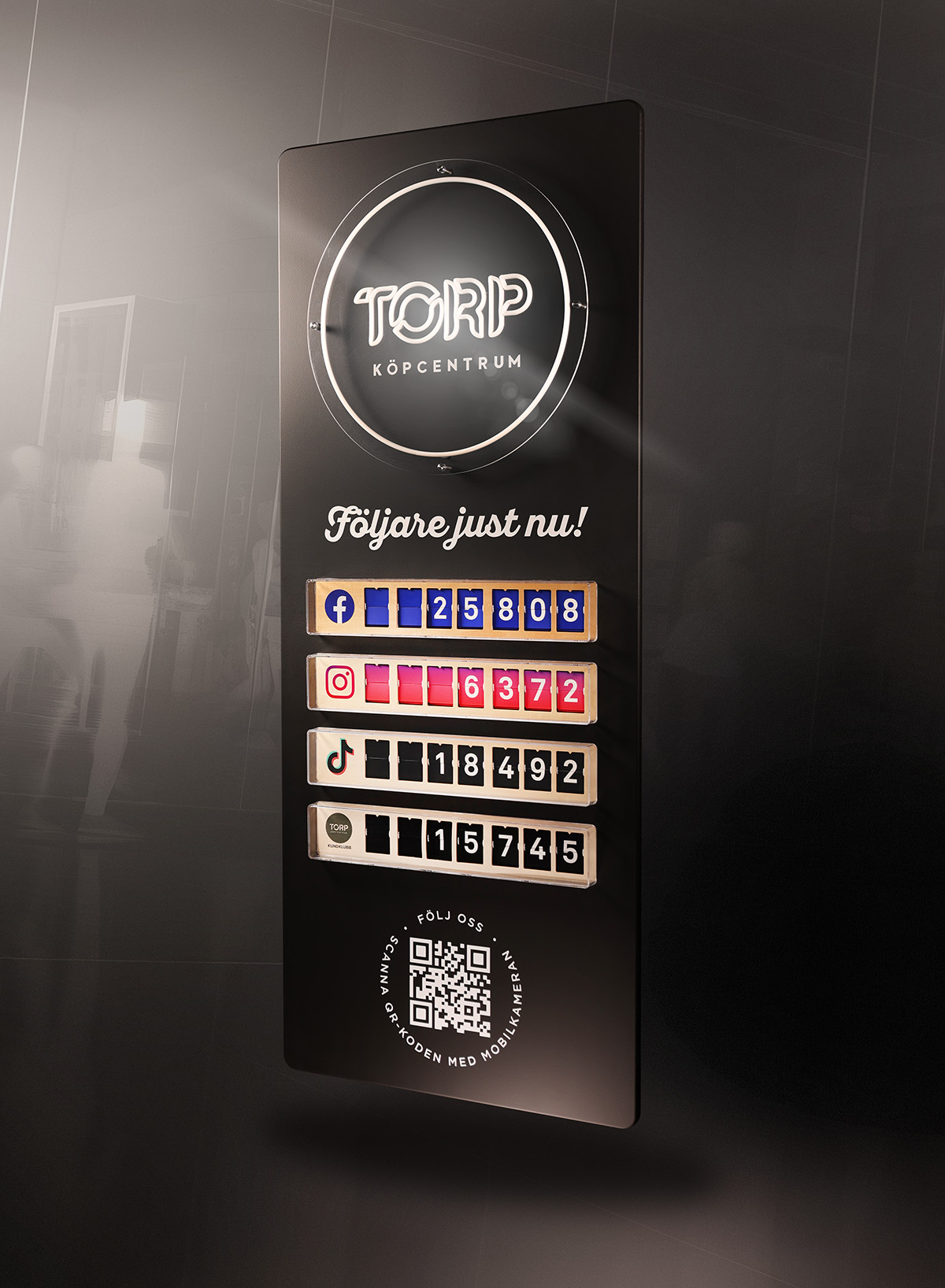 Den första Likemii-installationen monteras på Torp Köpcentrum under juli 2025 och är konfigurerad med neon-toppskylt och räknare för Facebook, Instagram, TikTok och Torp Köpcentrum kundklubb.