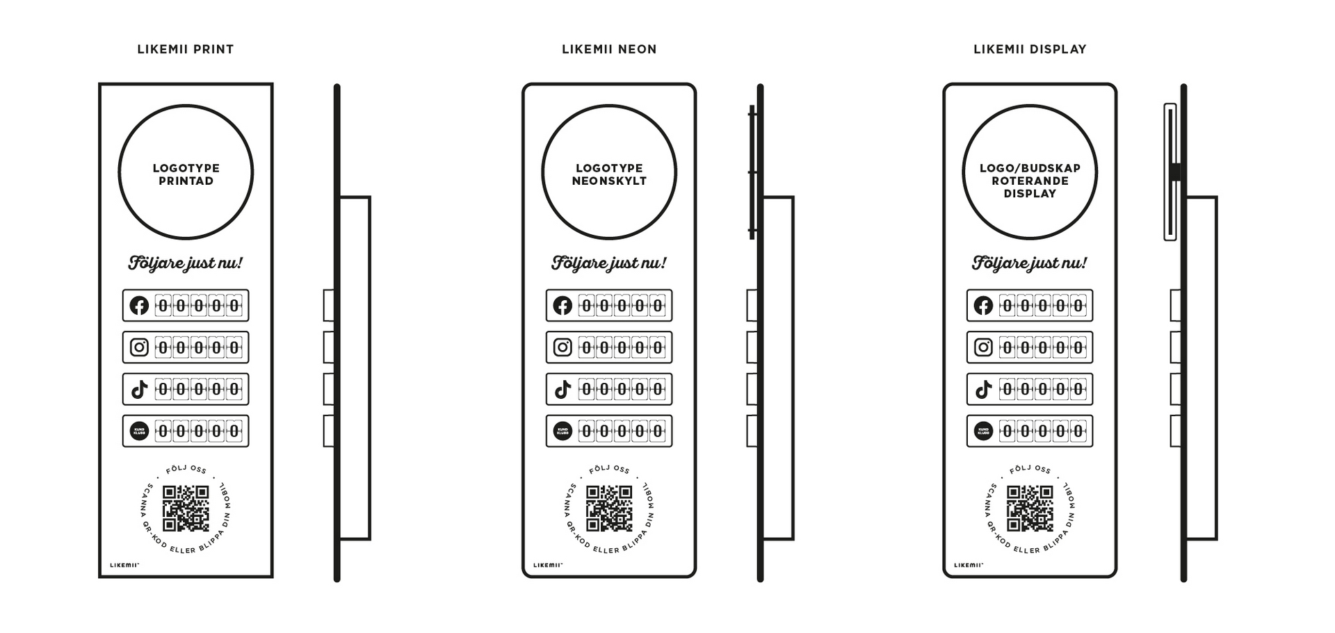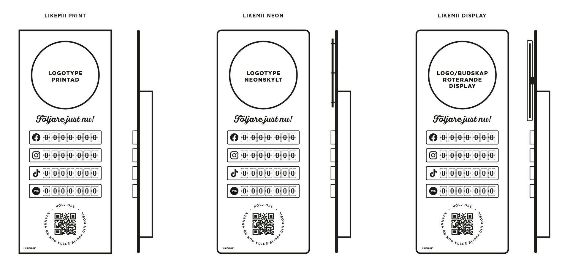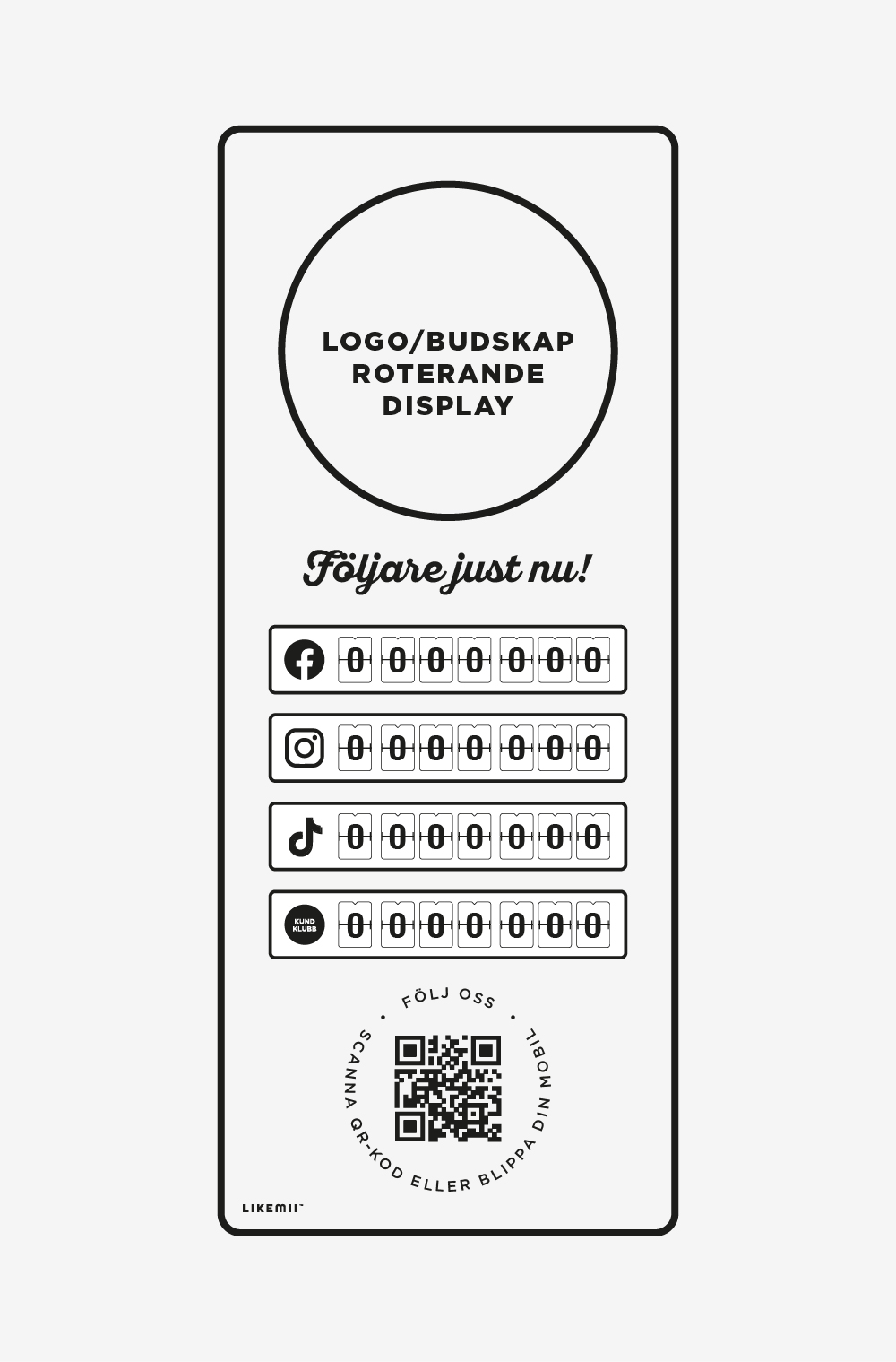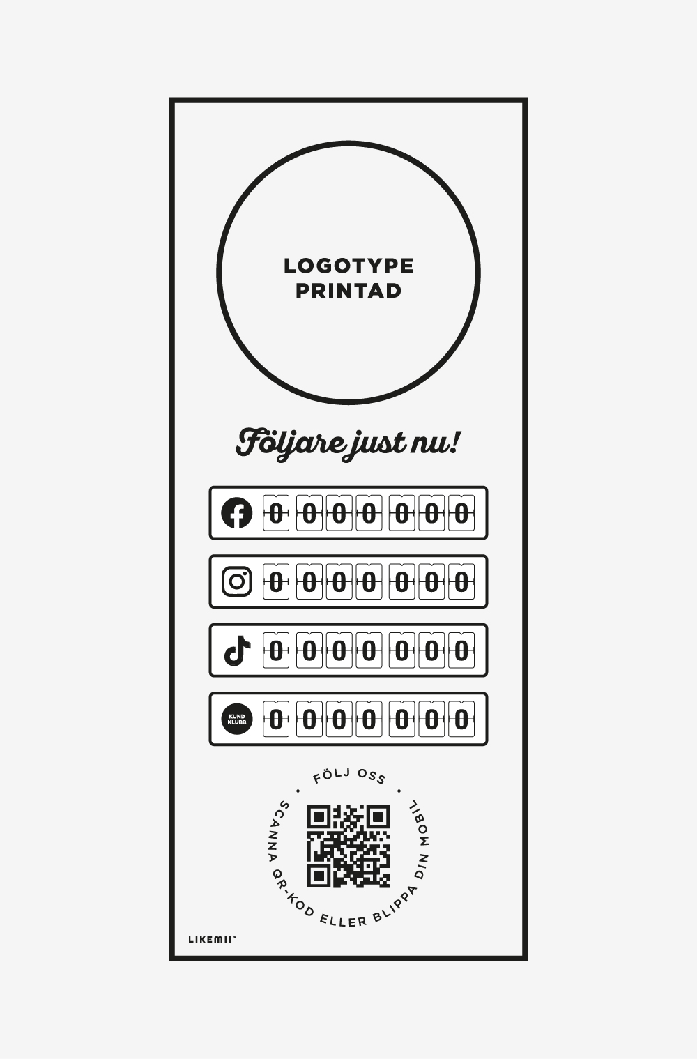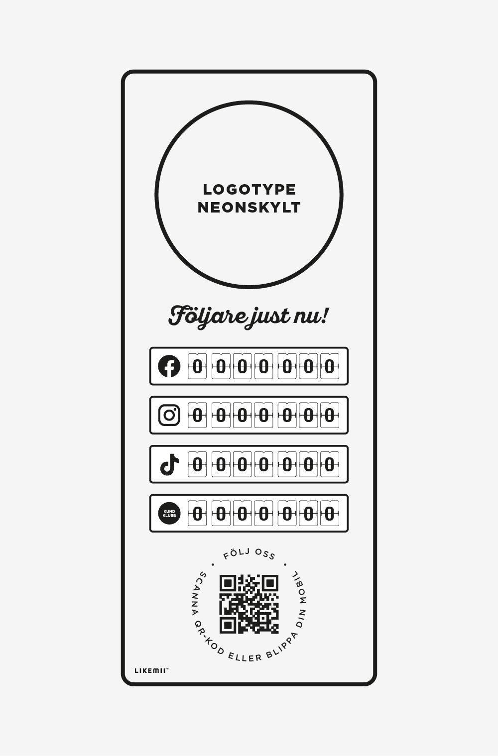 Varje Likemii-enhet kan skräddarsys med upp till fyra räkneverk och finns i både 5- och 7-siffriga versioner. Ni väljer själva vilka kanaler som ska visas – exempelvis Facebook, Instagram, TikTok eller en specialräknare för er kundklubb.